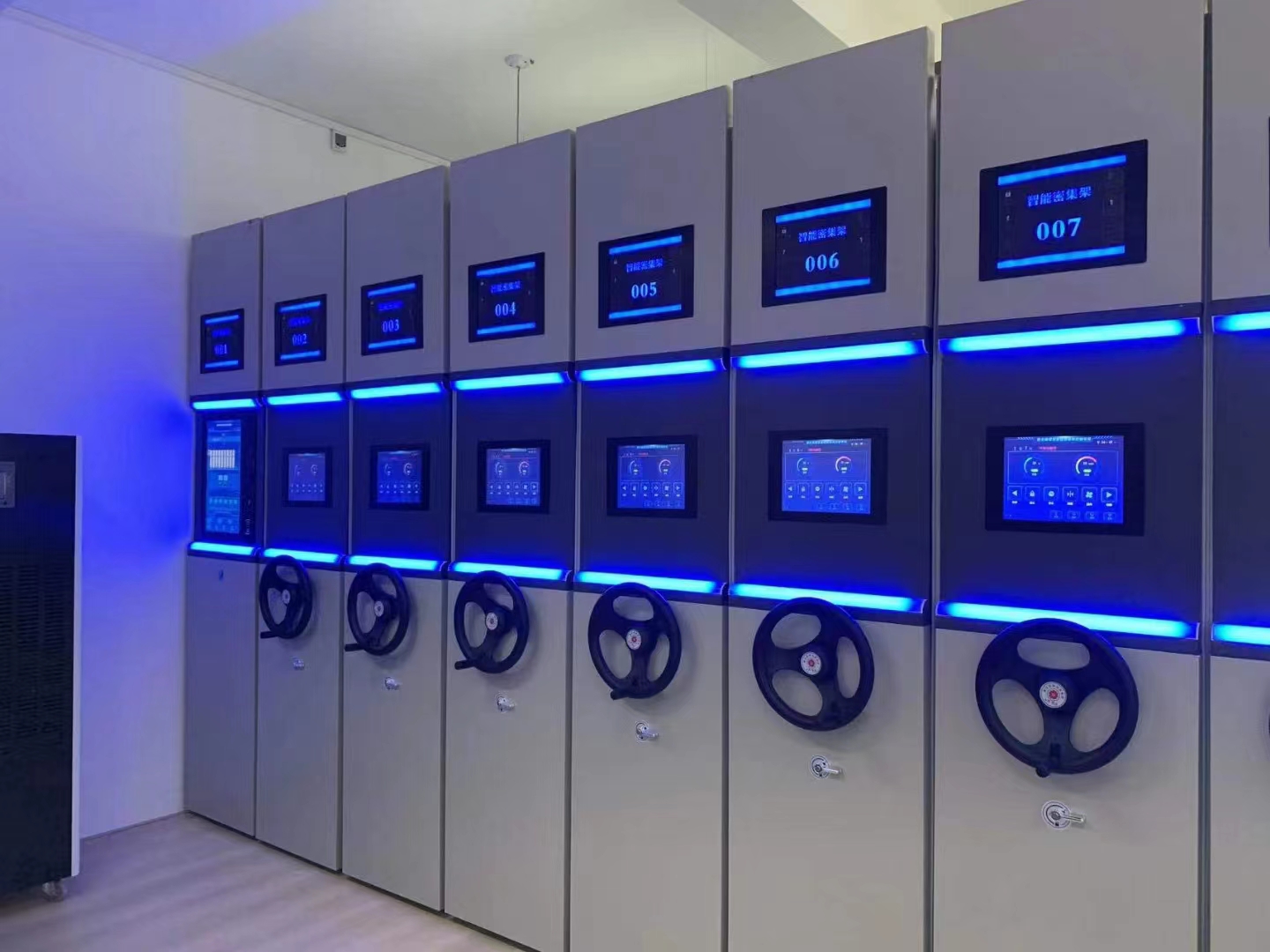 電腦多功能密集架具有操作到位時照明燈自動開啟、關閉的功能,方便用戶現場查閱資料。